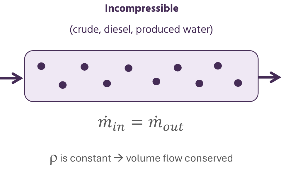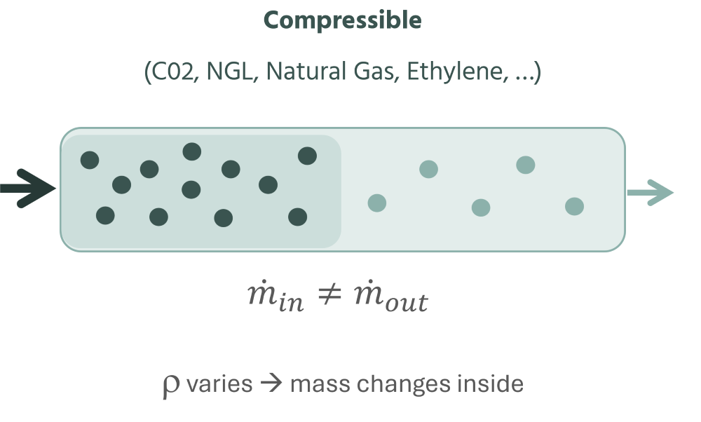With compressible fluids, mass in the line varies greatly with operations. The volume in often does NOT match the volume out.